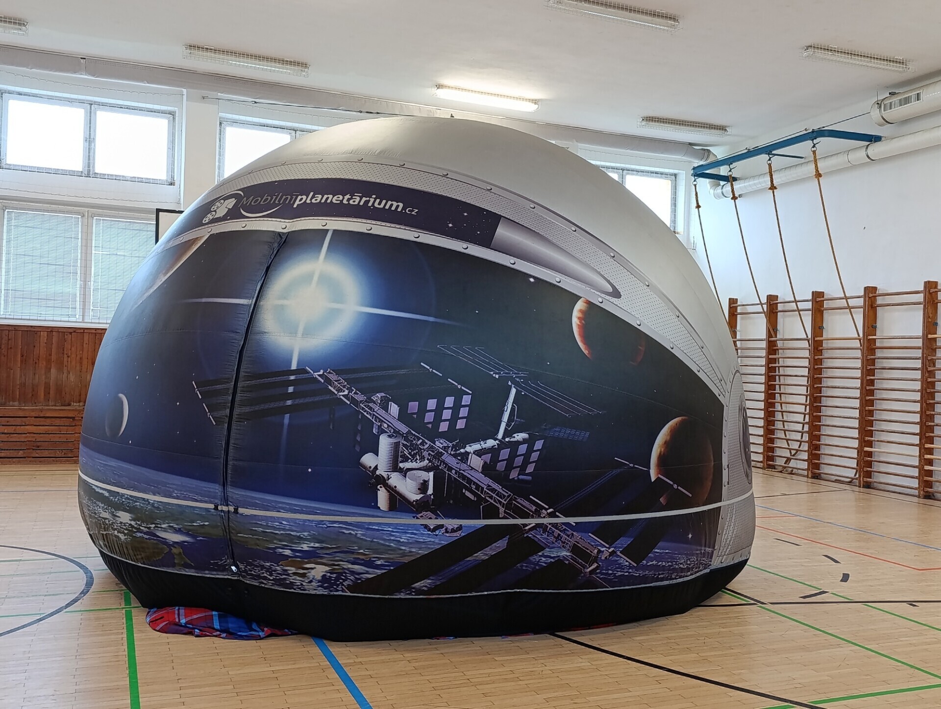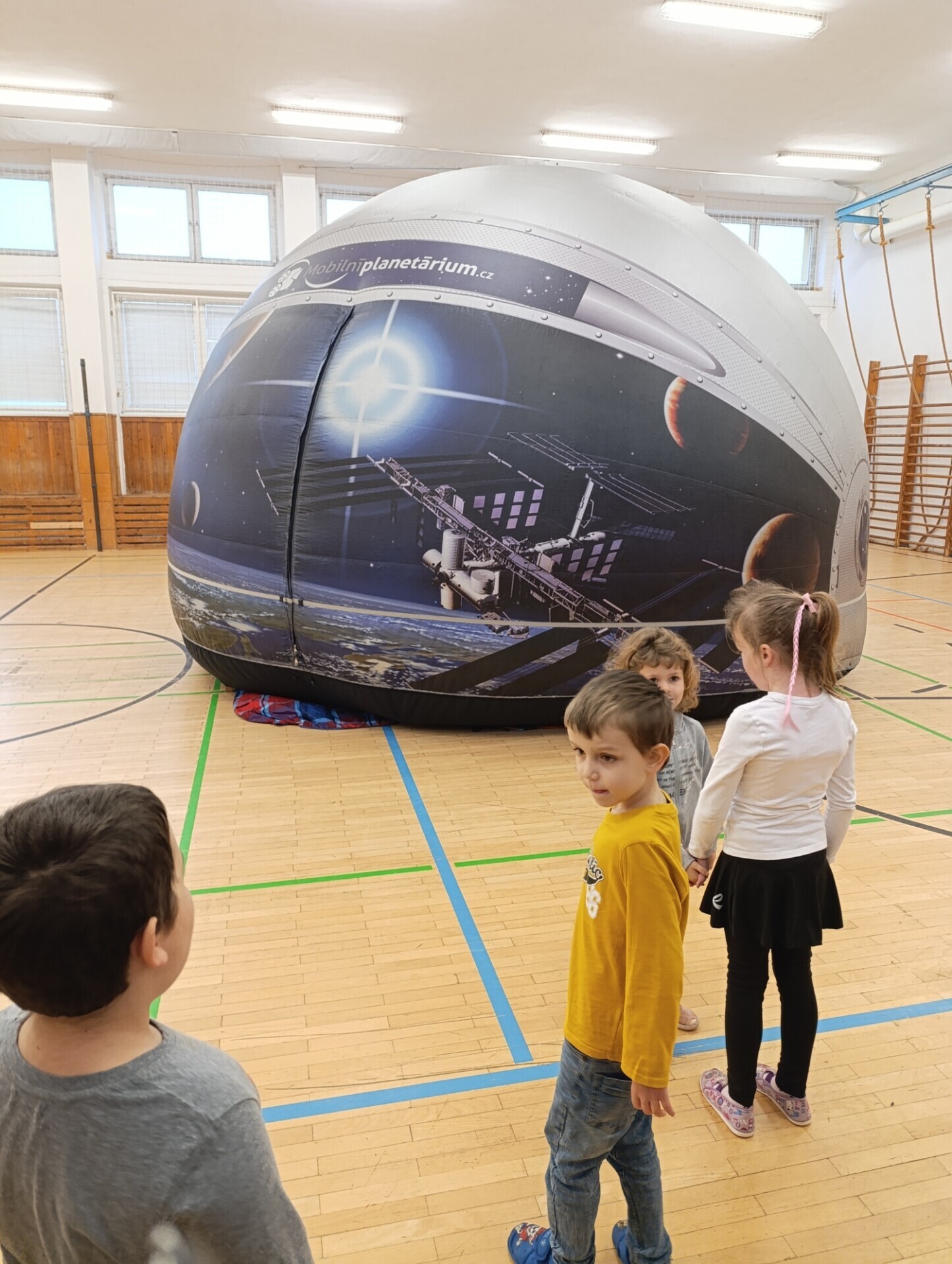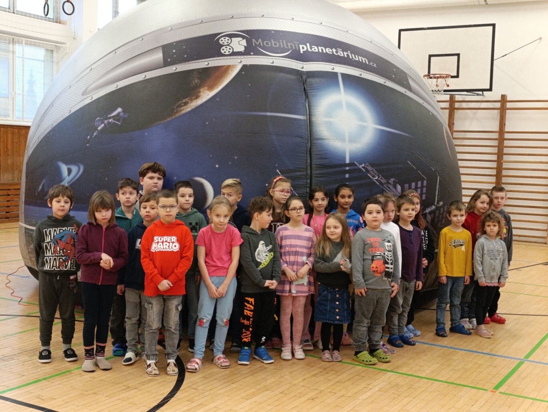 V pondělí 15. prosince 2025 zavítalo mobilní planetárium do tělocvičny naší školy. Postupně se zde vystřídali žáci 1. až 5. třídy. Uvnitř nafouknuté kupole se děti rozmístily na připravené žíněnky a vsedě či vleže si užívaly vybrané výukové programy. Některé se přenesly do vesmíru, jiné do přírody (např. koloběh vody). Lektorka programů doplňovala informace a děti se mohly aktivně zapojit do závěrečné diskuze. Bohužel i naši školu postihla vlna chřipek, a tak mnoho dětí chybělo. Přítomní žáci si ale program užili a upevnili si nabyté vědomosti.