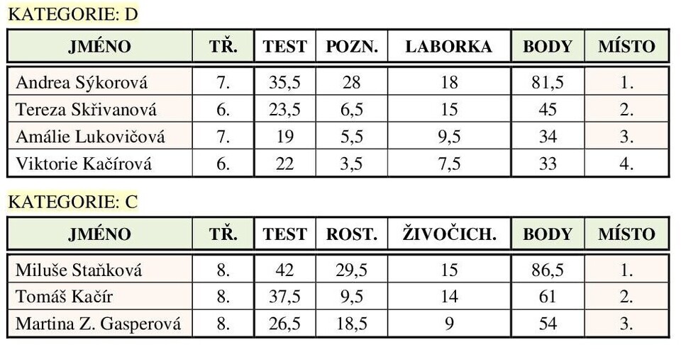 Soutěžící na prvních třech místech v obou kategoriích postupují do okresního kola.