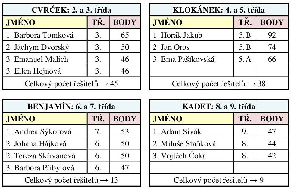 Žáci opět řešili testy s výběrem odpovědí, zaměřené na logické myšlení, nikoliv jen na školní znalosti. Jak se dařilo nejúspěšnějším žákům z každé věkové kategorie, ukazují následující tabulky: